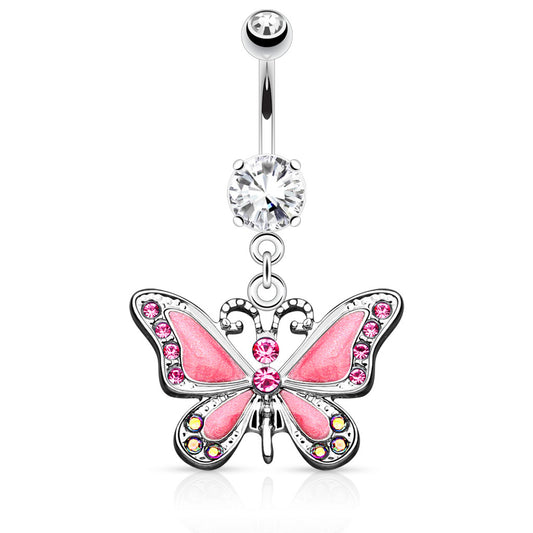 316L Surgical Steel CZ Butterfly With Double Round and Marquise Prong Set Belly Bar