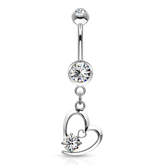 Hollow Heart with Prong CZ Dangle Belly Bar
