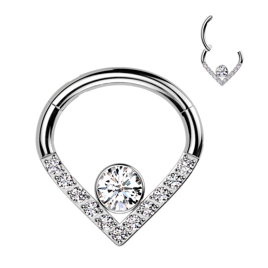 Implant Grade Titanium Hinged Segment Hoop Ring With Pave CZ Single Line Chevron and CZ