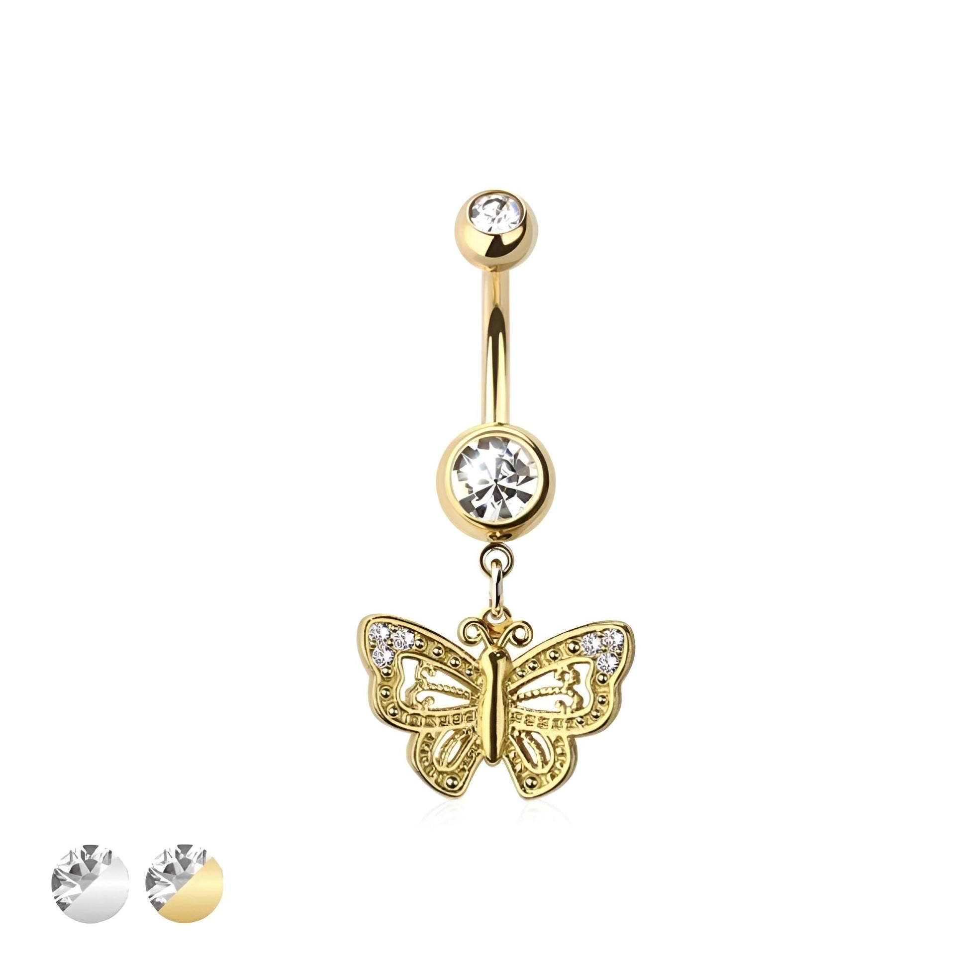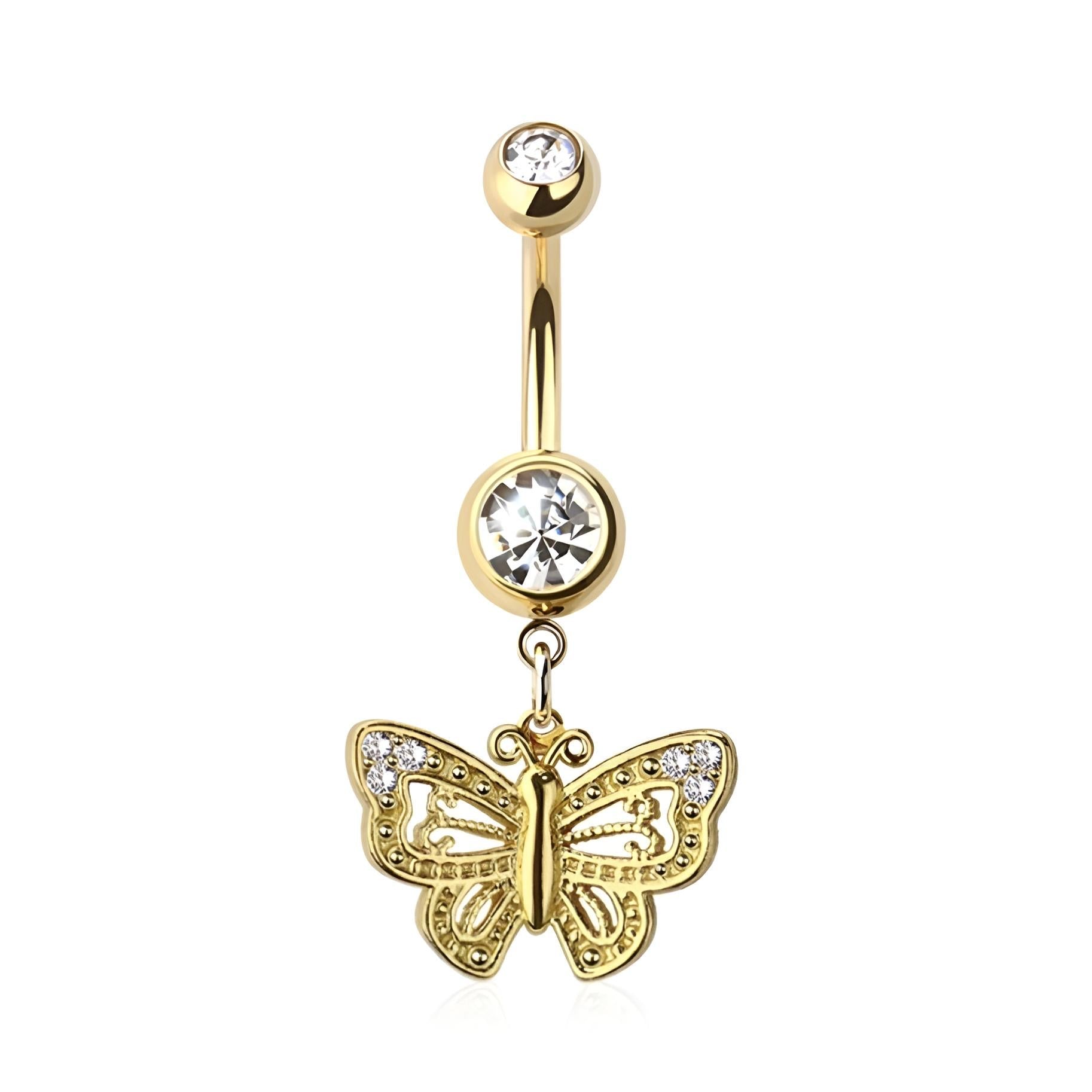 Crafted from durable 316L surgical steel and alloy, this Butterfly Belly Bar combines strength with style. Featuring a 1.6mm thickness and a 10mm bar length, it offers a comfortable fit while showcasing a sparkling multi-CZ butterfly charm that adds a touch of elegance to your look. Perfect for those seeking both quality and eye-catching design in their navel jewellery.
