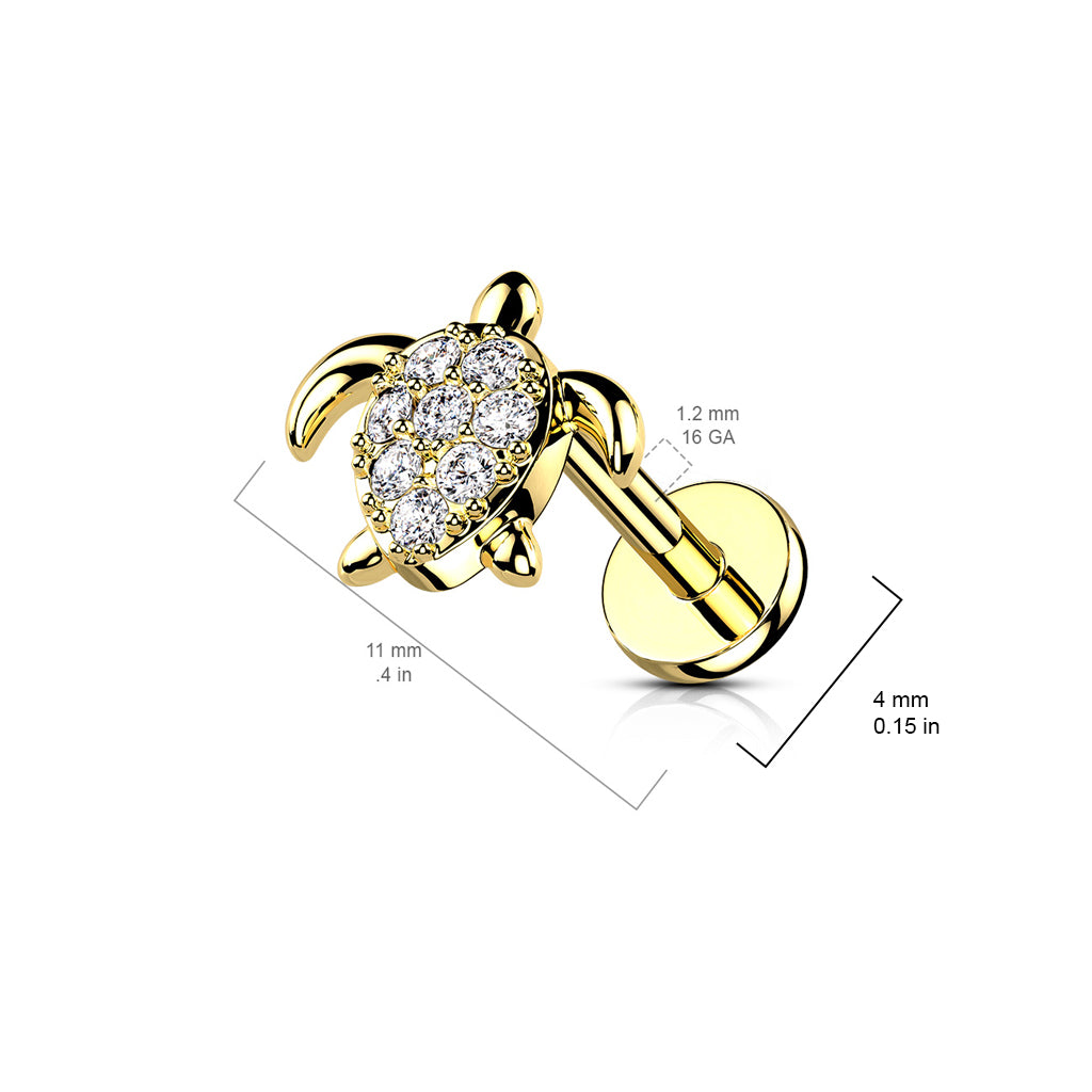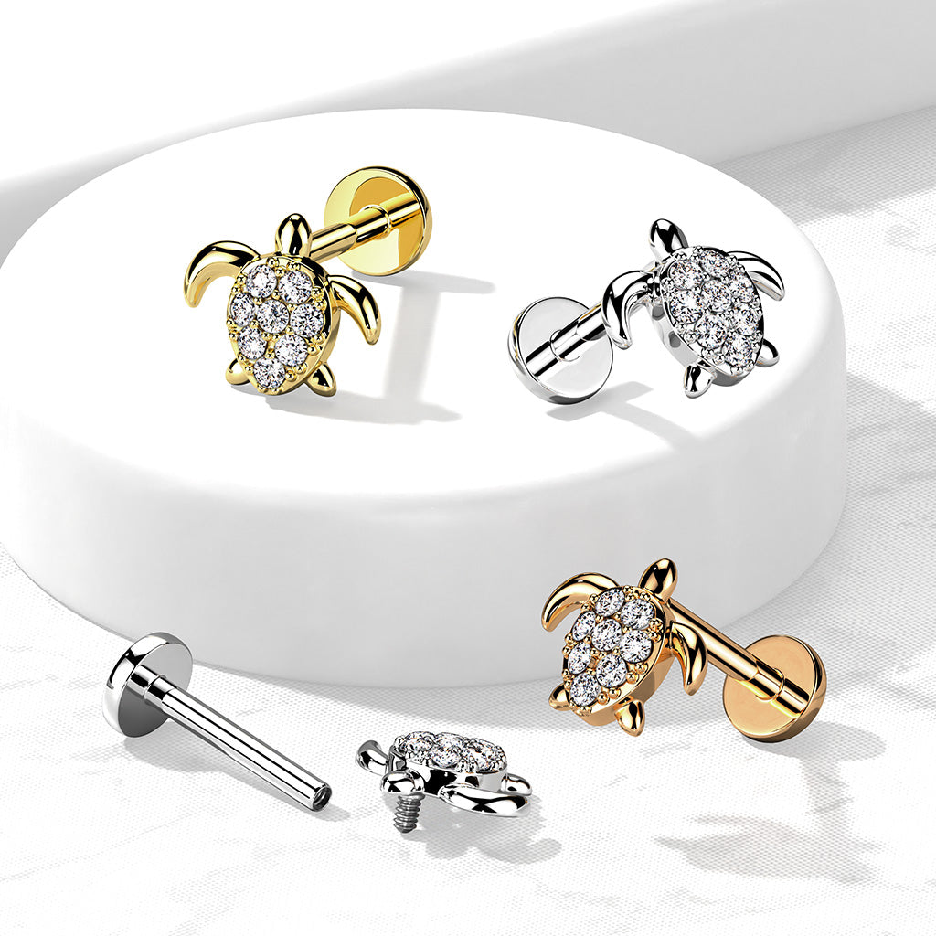 Introducing the CZ Paved Turtle Internally Threaded 316L Surgical Steel Flat Back Studs. Crafted with surgical-grade, these flat back studs are ideal for a variety of piercings - from the labret to the cartilage. These studs are internally threaded for increased comfort and are adorned with diamond-like cubic zirconia stones for added sparkle.
