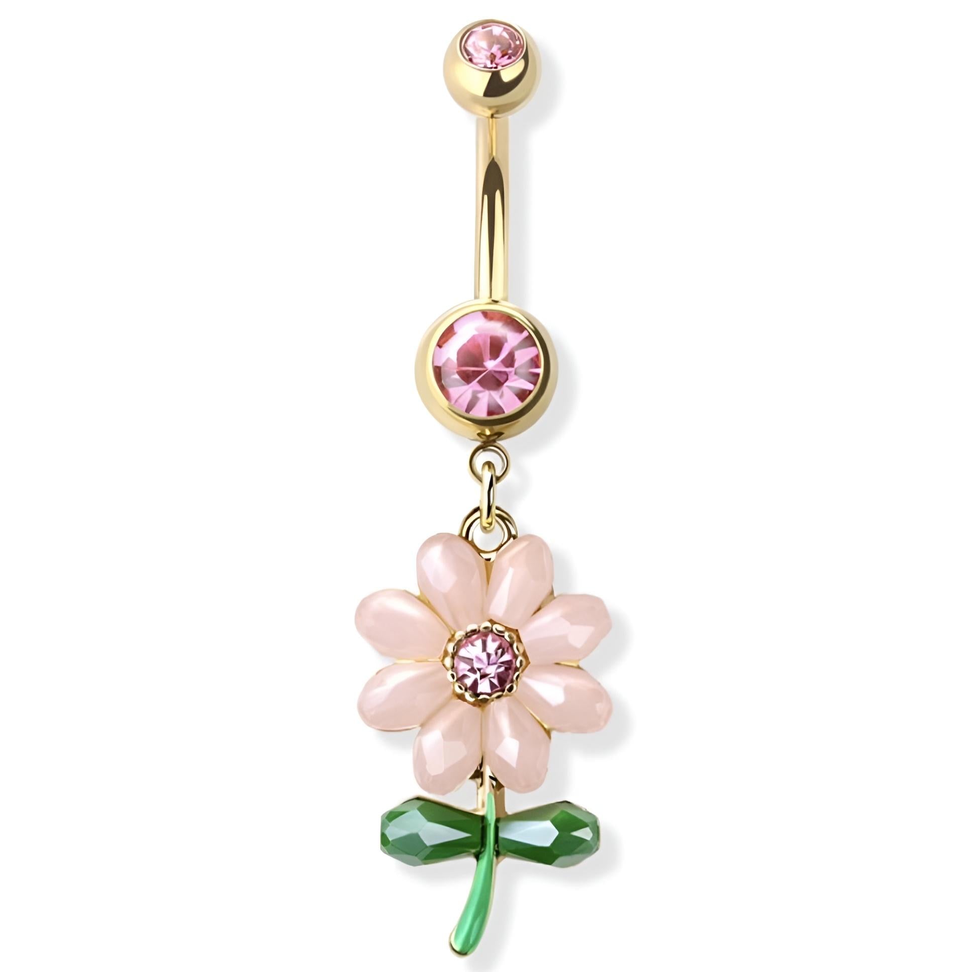 Elevate your style with our Flower Cz Belly Bar! Made from 316L surgical steel and brass, this 1.6mm thick belly bar features a charming pink flower, a delicate green leaf, and a sparkling pink gem. With a 10mm bar length, it's the perfect accessory to add a touch of beauty to any outfit.