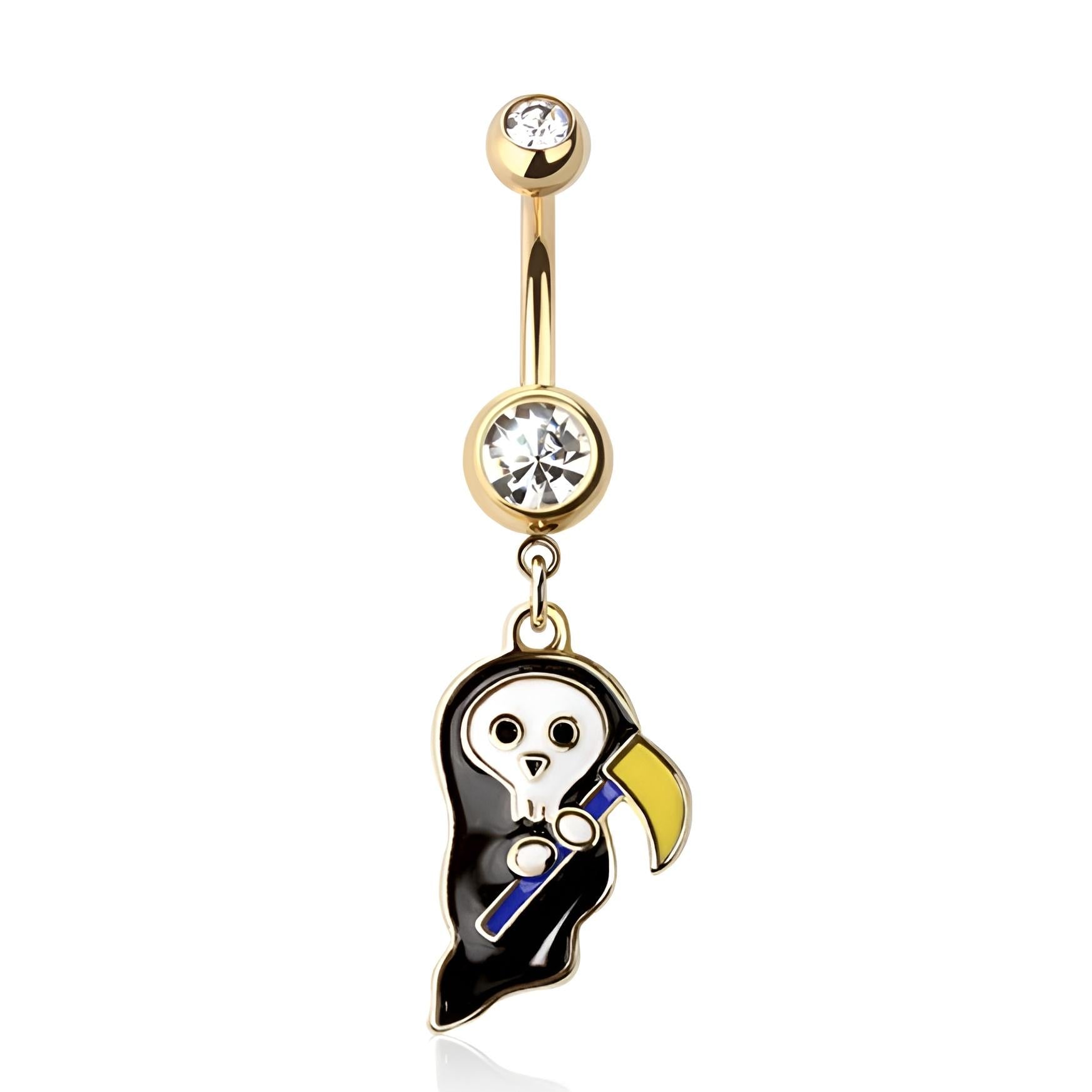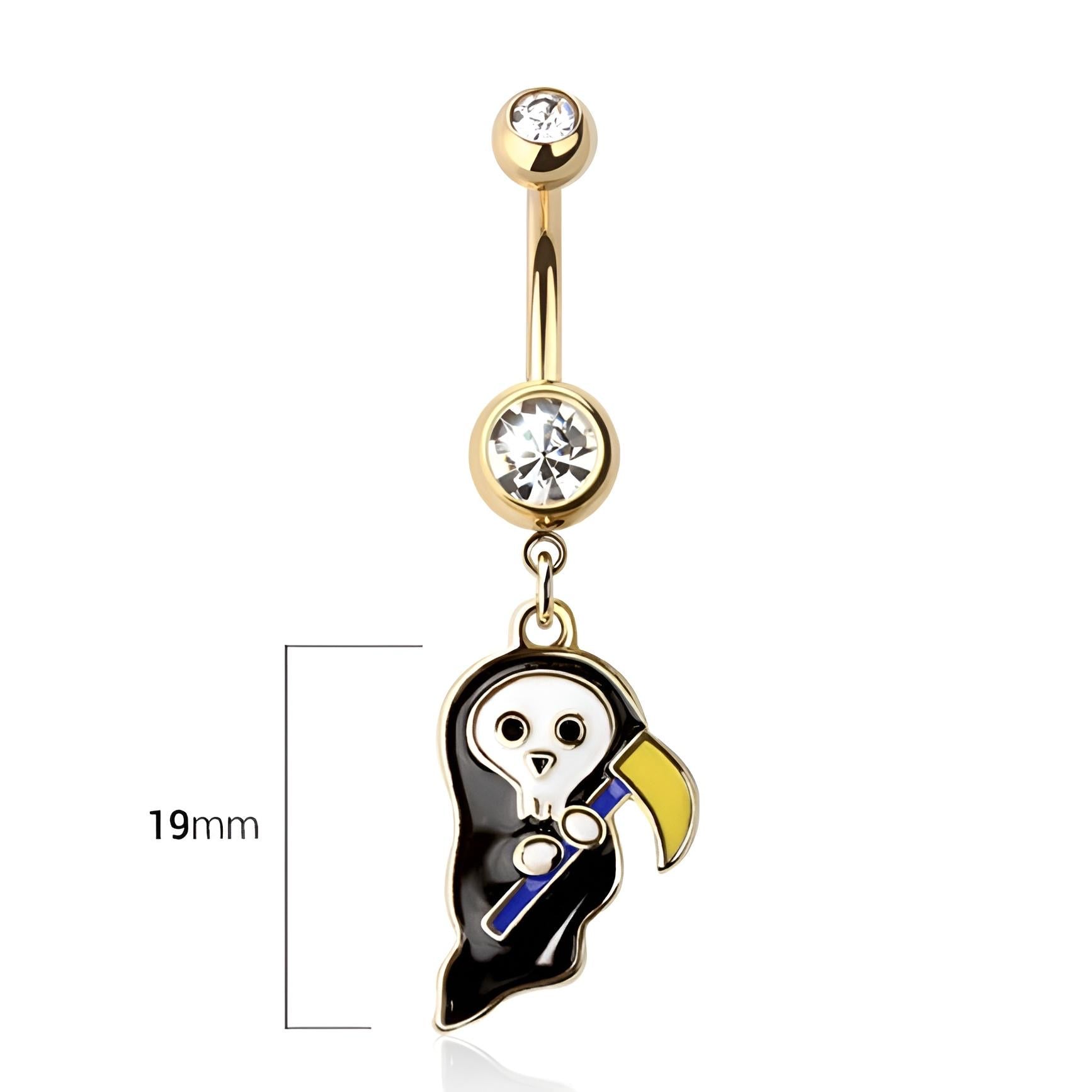 Crafted from durable 316L surgical steel and alloy, the Grim Reaper Scythe Belly Bar offers both strength and style. With a comfortable 1.6mm thickness and a 10mm bar length, it ensures a secure fit while making a bold statement. Perfect for those seeking edgy, long-lasting body jewellery that stands out.