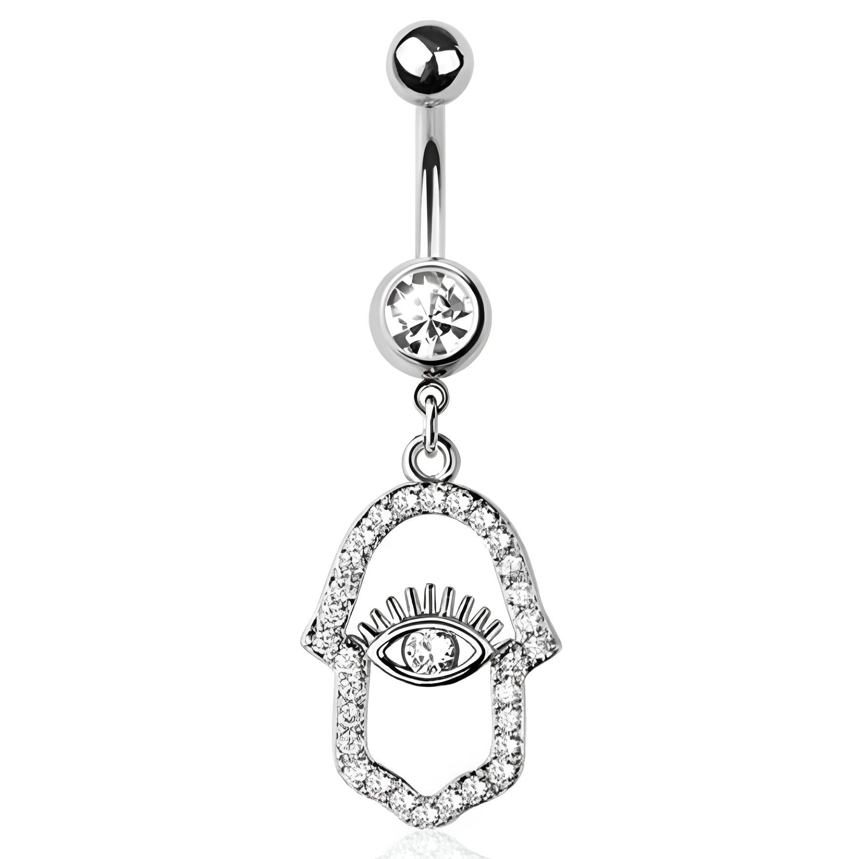 Experience divine protection and adorn your belly piercing with our Hamsa Hand Eye Multi Cz Belly Bar. Made of high-quality 316L surgical steel and brass, this 1.6mm thick belly bar measures 10mm in length. Embrace spiritual beauty with our unique and eye-catching design.