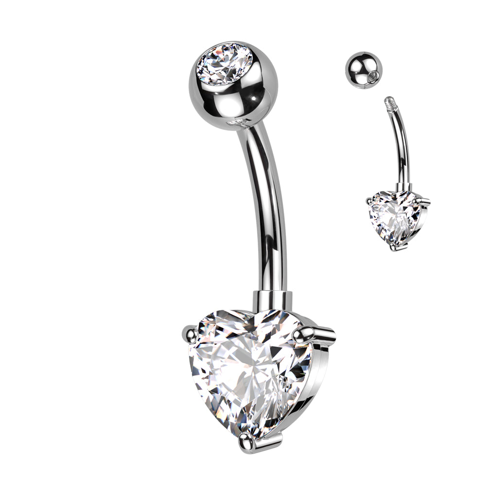 Elevate your body jewelry collection with our Implant Grade Titanium Belly Button Ring featuring a stunning pressed fit CZ top and heart brass prong set CZ design. The 1.6mm thickness and 10mm bar length provide optimal comfort and fit. Crafted specifically for sensitive skin, this premium quality navel ring combines elegant style with the hypoallergenic properties of implant grade titanium, ensuring you can showcase your personal style without irritation.