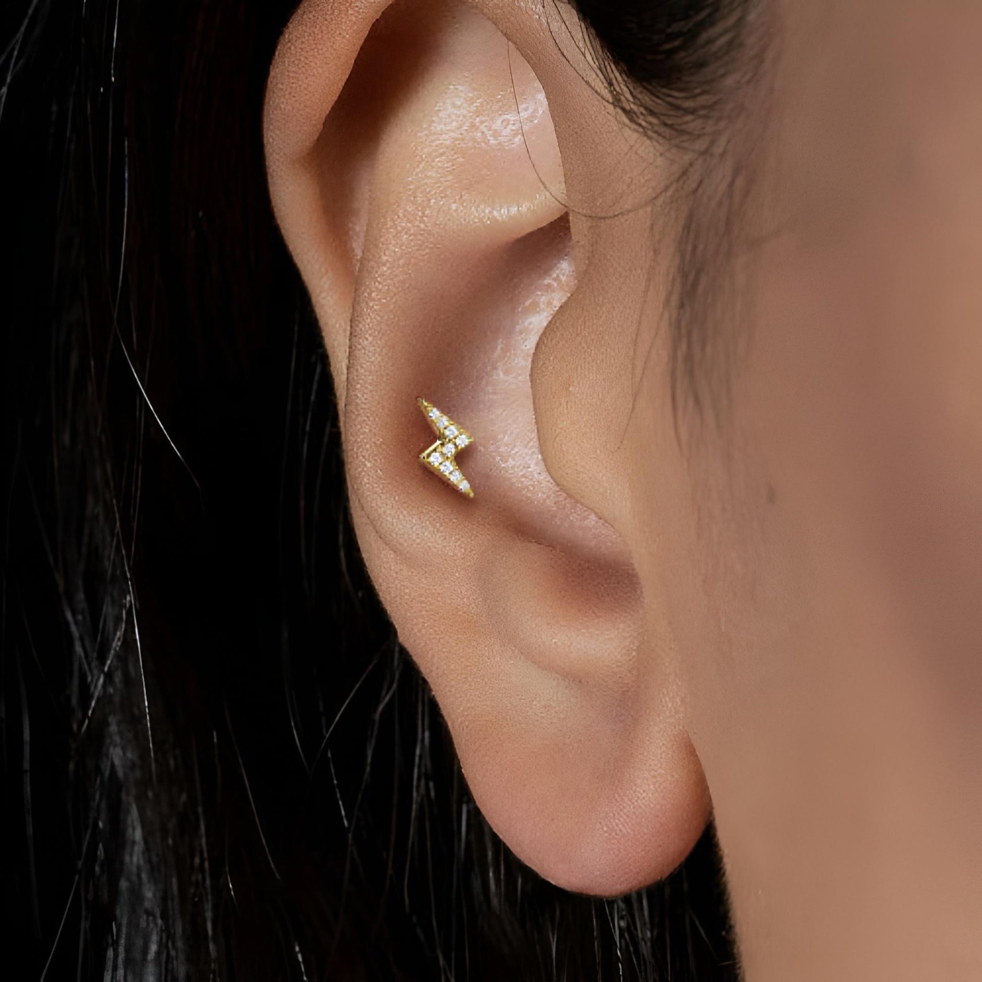 The Lighting Bolt Labret features a lightning-shaped design paved with round CZs and constructed of surgical-grade 316L stainless steel. Its flat back and internal threading make it ideal for cartilage, labret, and other body piercings.