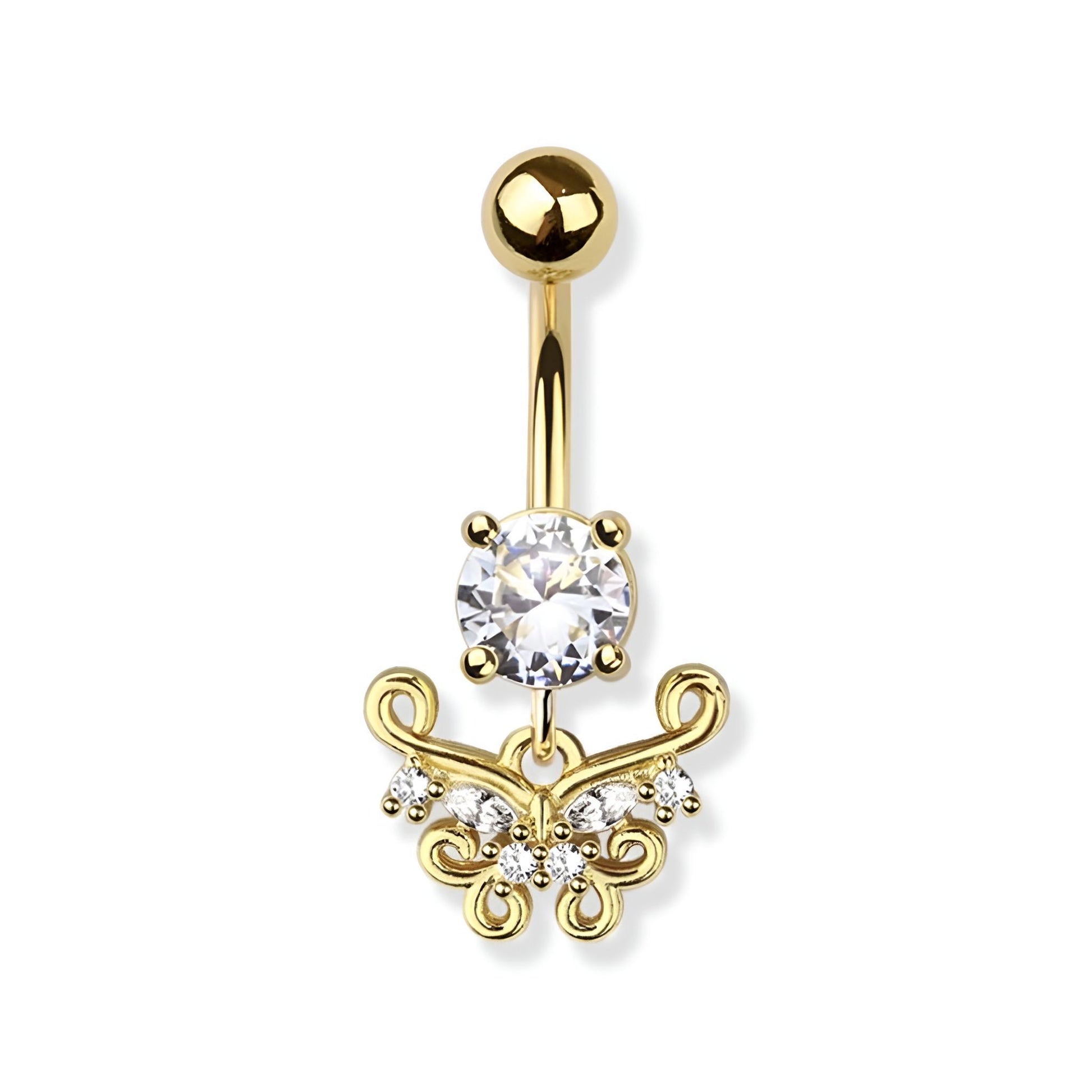 Enhance your belly button piercing with our Paved Butterfly Belly Bar crafted from 316L surgical steel and brass. With a 1.6mm thickness and 10mm bar length, this belly bar is both stylish and comfortable. Add a touch of elegance to any outfit with the sparkling paved butterfly design.