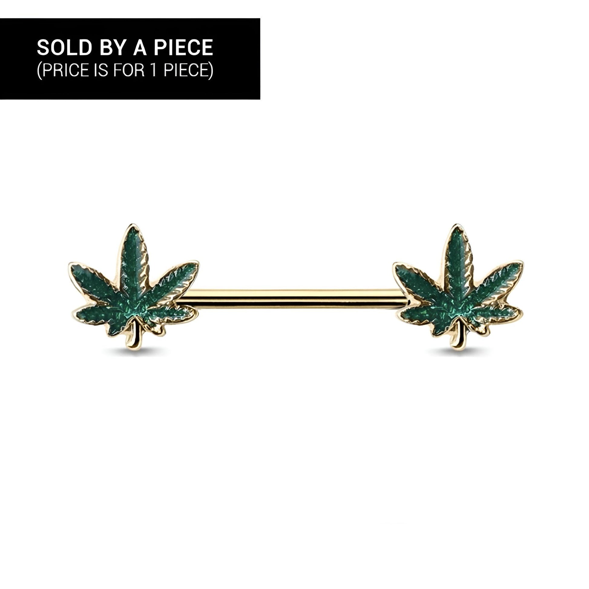 This Pot Leaf Nipple Bar combines high-quality 316L surgical steel and brass for durability and safety. Featuring a 1.6mm thickness and a 14mm bar length, it ensures a secure and comfortable fit.