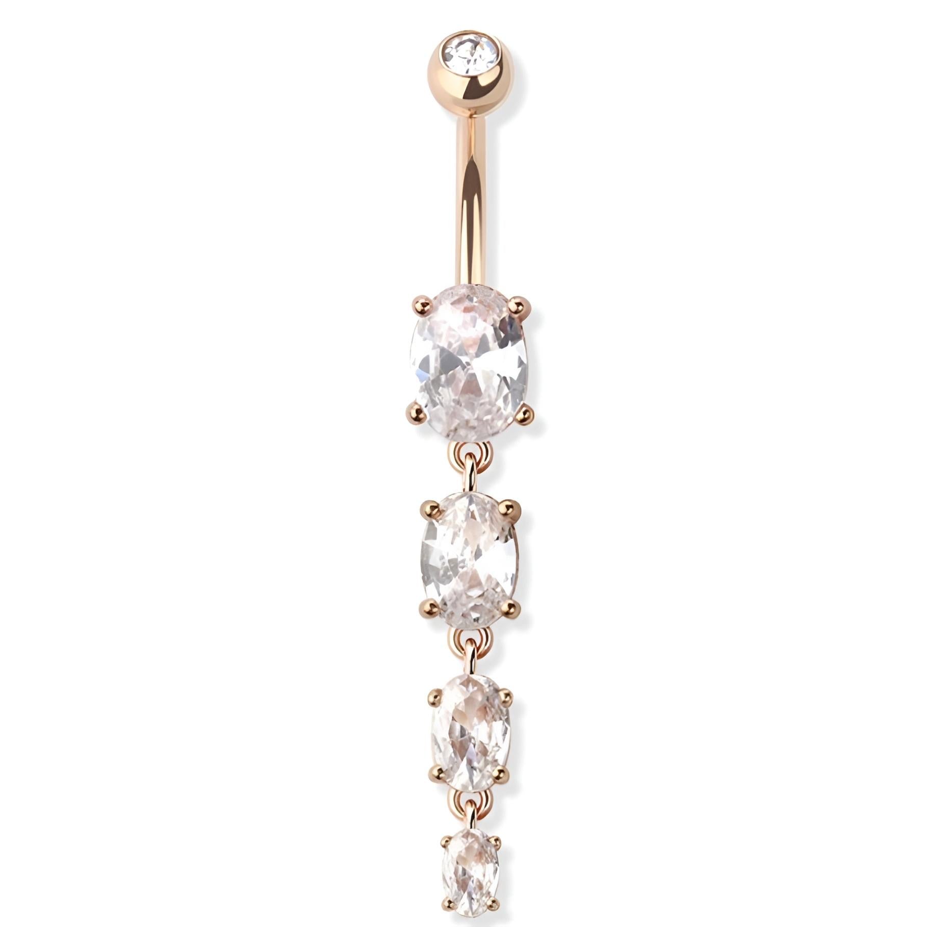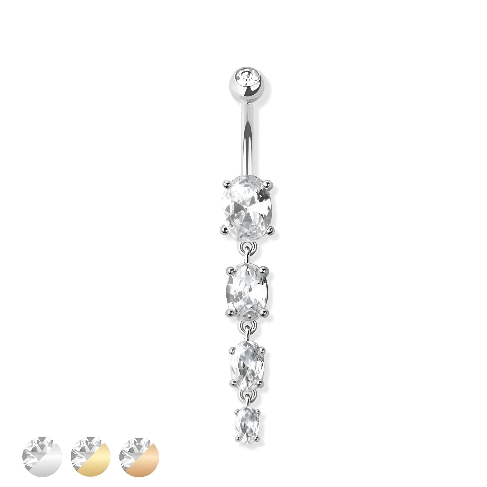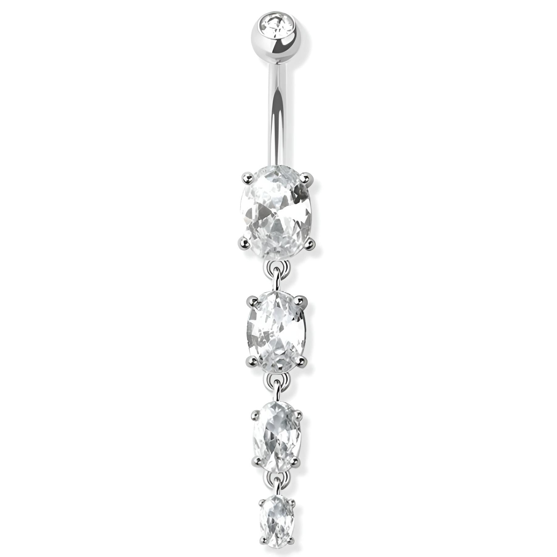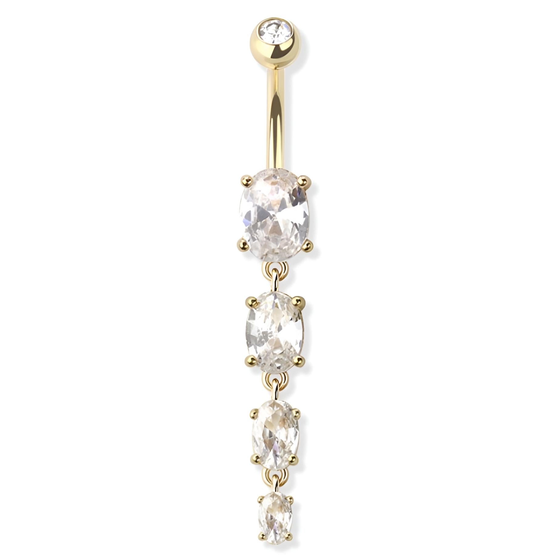 This Prong Set Four Oval Gem Belly Bar is crafted from durable 316L surgical steel and brass. With a 1.6mm thickness and a 10mm bar length, it offers a comfortable fit while securely showcasing four oval gems. Perfect for adding a subtle sparkle to your style with reliable quality you can trust.