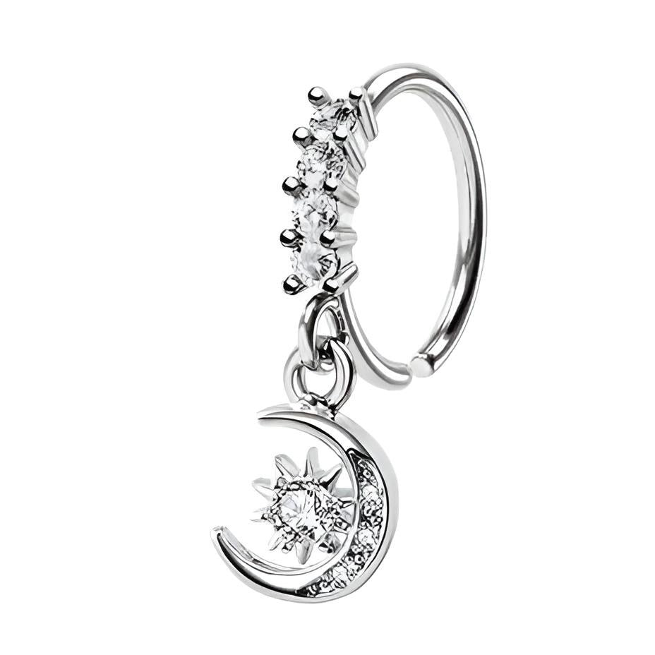 The Sun and Moon Crystal Dangling Nose Ring has a diameter of 8mm, making it a noticeable accessory that is sure to catch the eye. The dangling feature of the ring adds a touch of elegance and sophistication to any outfit, making it a great choice for both casual and formal occasions.
